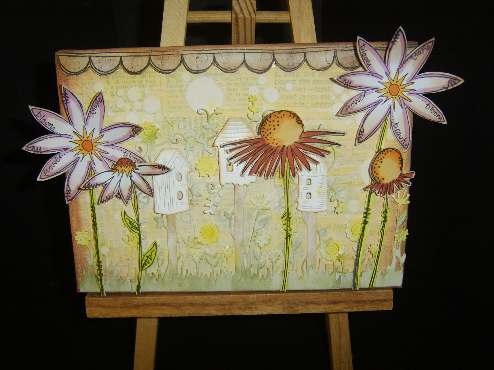 In the background I have chosen to use a Tattered Lace die - Birdhouse row - I used smooth white cardstock and coloured some of the detail but left some white so they pop out nicely.